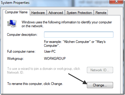 Now click on the Computer Name tab and click on the Change button at the bottom: