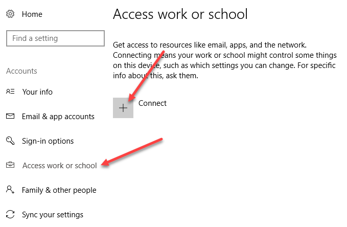 In Windows 10, there is the Settings dialog and there is the Control Panel. Both overlap in many areas and it’s a bit confusing. If you click on Start in Windows 10, click on the Setting icon (the gear icon), then click on Accounts, you’ll an option called **Access work or school **in the left-hand column.