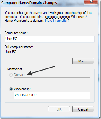 Note that on my computer, the Domain and the Network ID buttons are grayed out! Why so? Well, it’s because I have Windows 7 Home Premium.