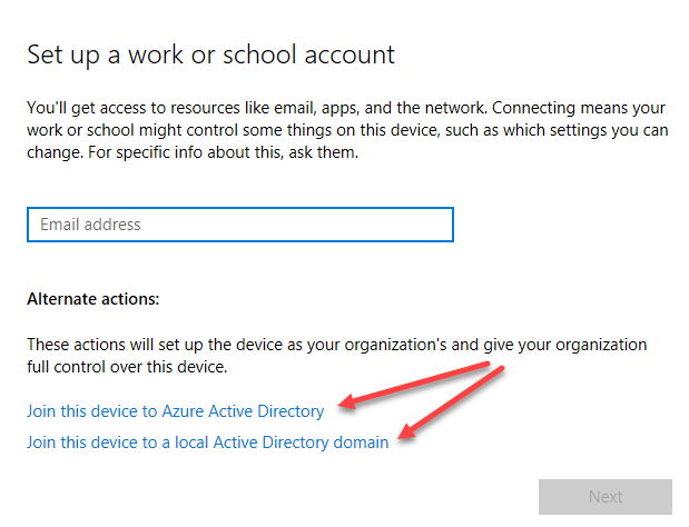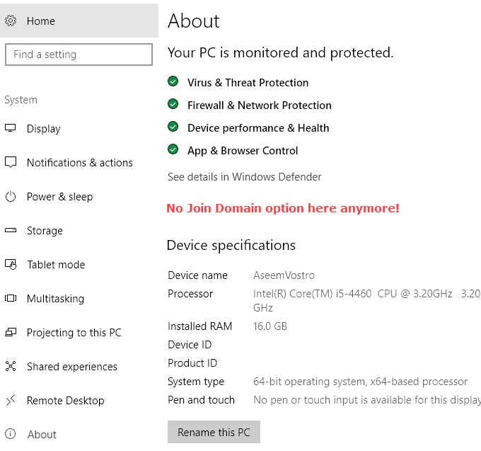 You might see a bunch of other sites saying that you should go to Settings, then System and then About and clicking on the** Join Domain** button, but that seems to have been removed in the newer editions of Windows 10. I even tried enabling the local Administrator account and the option still didn’t show up there. Now it really just gives you info about your computer and that’s it. You can’t join a domain from that screen.