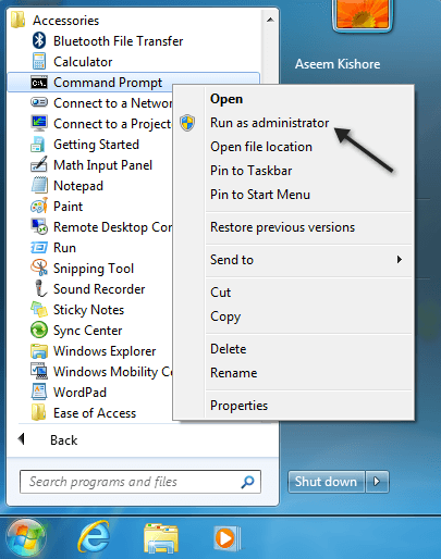 You can get to an elevated command prompt by going to Start, then Accessories and right-clicking on Command Prompt and choosing Run as Administrator. In new versions of Windows, just search command prompt from the Start Menu and then right-click on the first result.