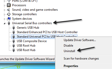 Go ahead and right-click on each item under **Universal Serial Bus controllers **and choose Uninstall. After you have uninstalled all items, go ahead and restart your computer and it will automatically reinstall each USB port.
