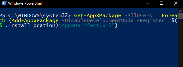- Paste this script: **Get-AppXPackage -AllUsers | Foreach {Add-AppxPackage -DisableDevelopmentMode -Register “$($_.InstallLocation)\AppXManifest.xml”} **and press **Enter**.