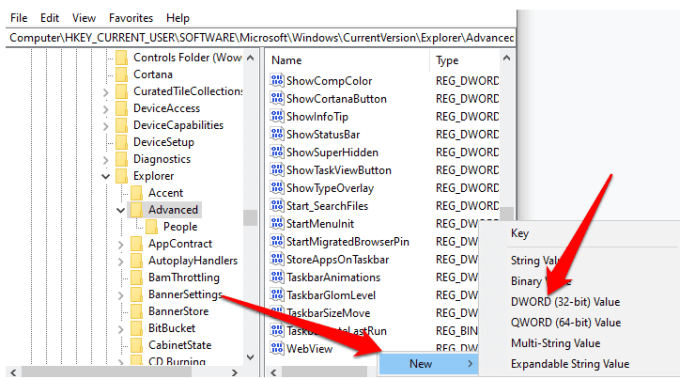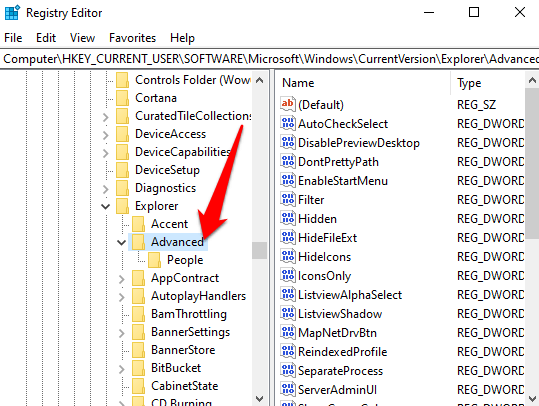 - Navigate to the HKEY_CURRENT_USER > Software > Microsoft > Windows > CurrentVersion > Explorer > Advanced key.
