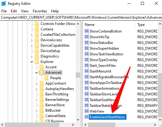 - Label the key **EnableXamlStartMenu**.