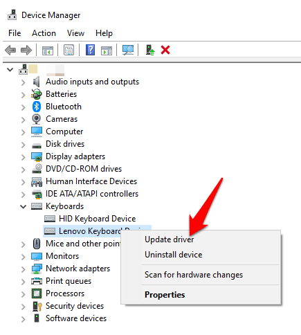 - Expand the **Keyboards** category, right-click your keyboard and select **Update Driver**.