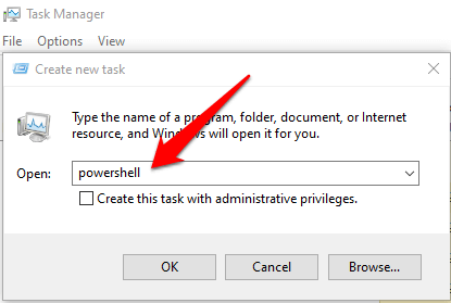 - Select **File > Run new task**, type **powershell** and select **OK**.