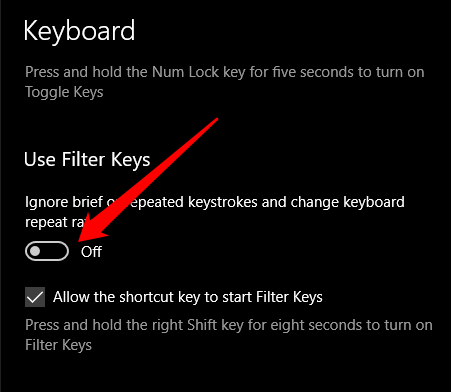 Filter Keys is an accessibility feature in Windows 10 that ignores repeated keys and helps you control the keyboard repeat rate. This feature may interfere with the Windows key owing to a bug or other software glitch that causes issues with your keyboard.