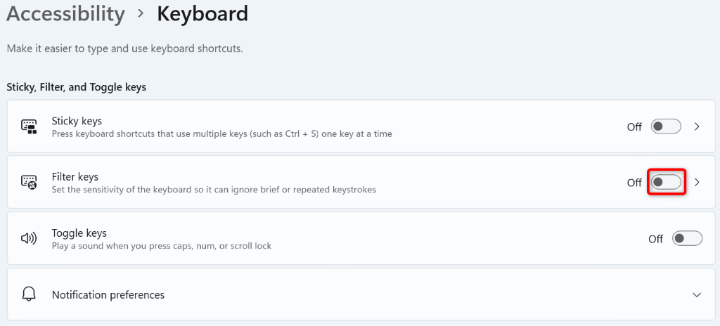 The Filters keys feature changes how your keys behave on your Windows 11 PC. It’s worth toggling off this feature when you find that your keyboard keys aren’t working as you expect.