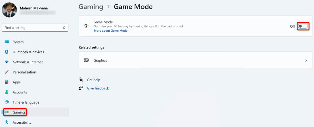 - Select Gaming in the left sidebar and Game Mode on the right pane. * Turn off the Game Mode toggle.