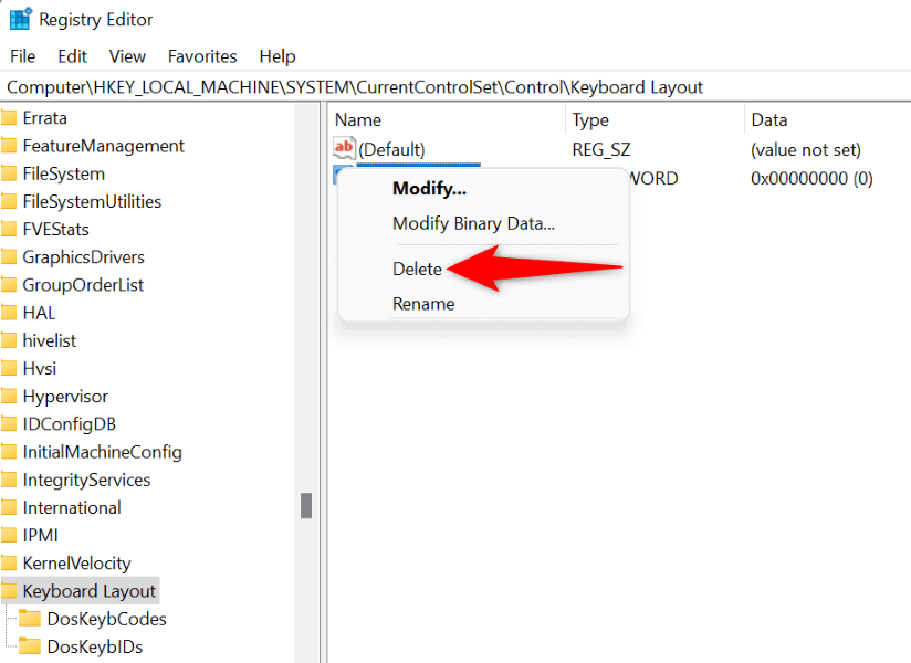 - Right-click the Scancode Map entry on the right and choose Delete.
