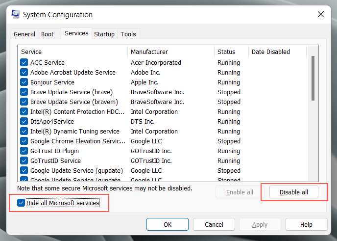 - Check the Hide all Microsoft services box and choose Disable all > OK.