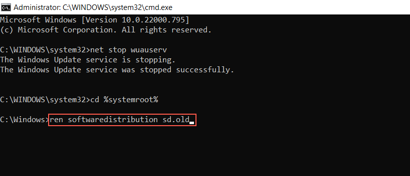 - Execute the following commands below to rename the directory that houses temporary Windows Update data: