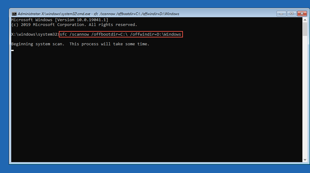 Select Command Prompt in WinRE, type the command below, and press Enter to launch the System File Checker: