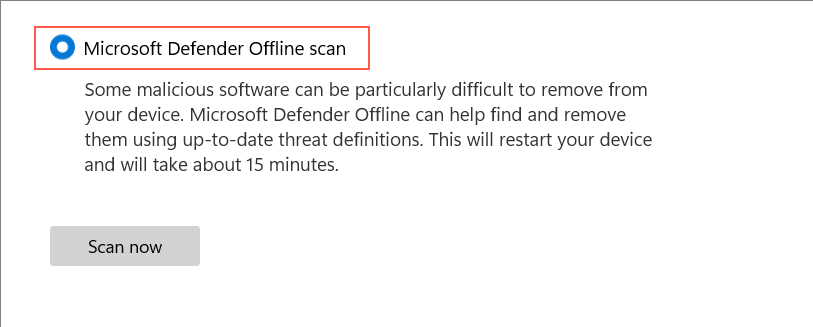 - Check the radio button next to Microsoft Defender Offline scan.