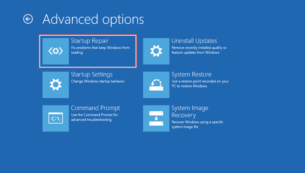 If a startup repair fails to work, reload the Windows Recovery Environment and continue with the next fix.