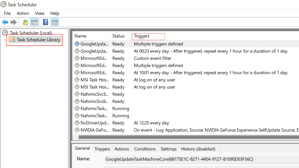 - In the Task Scheduler window under Task Scheduler Library, look for any tasks or scripts that are scheduled to run at regular intervals or at startup. This will be indicated in the Triggers column. If you find any tasks or scripts that you suspect could be causing the problem, you can right-click on the task or script and select Disable from the menu.