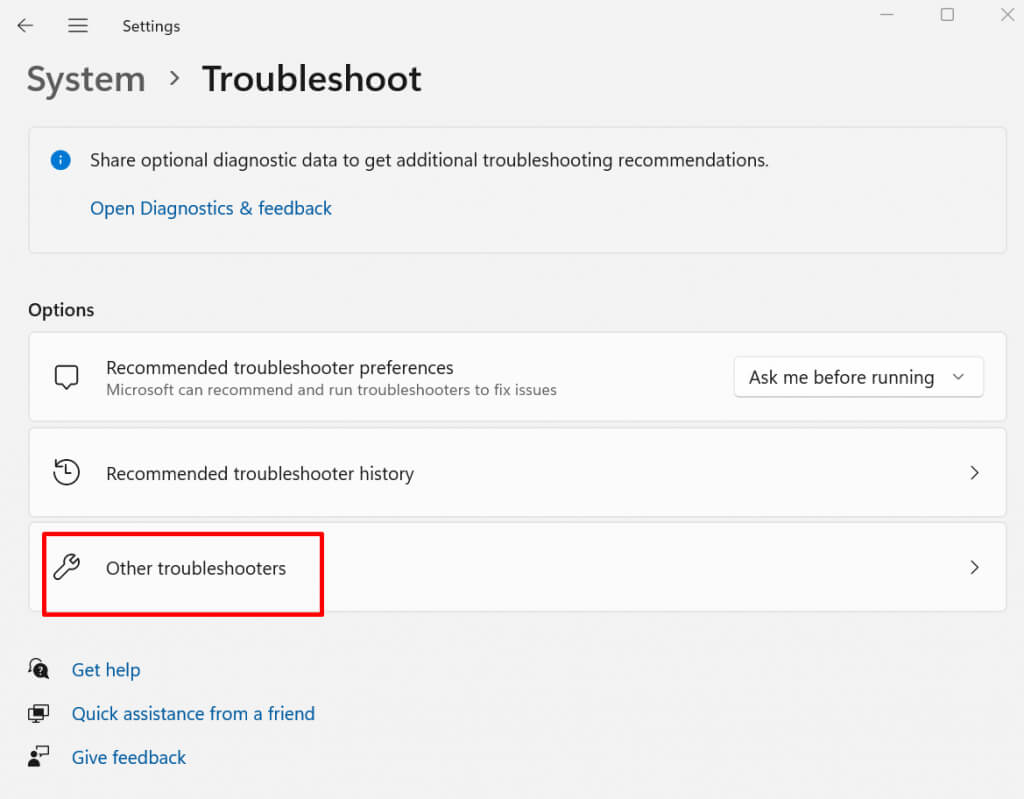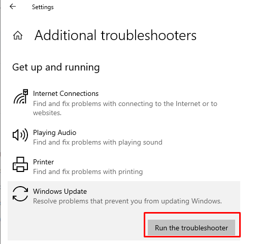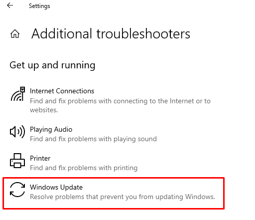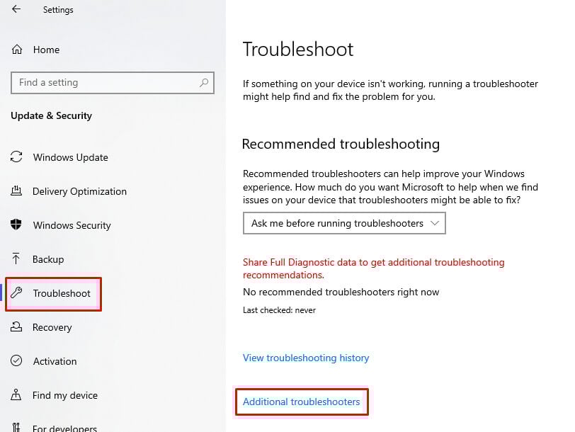- Select Troubleshoot, and from the right panel select Additional Troubleshooters.