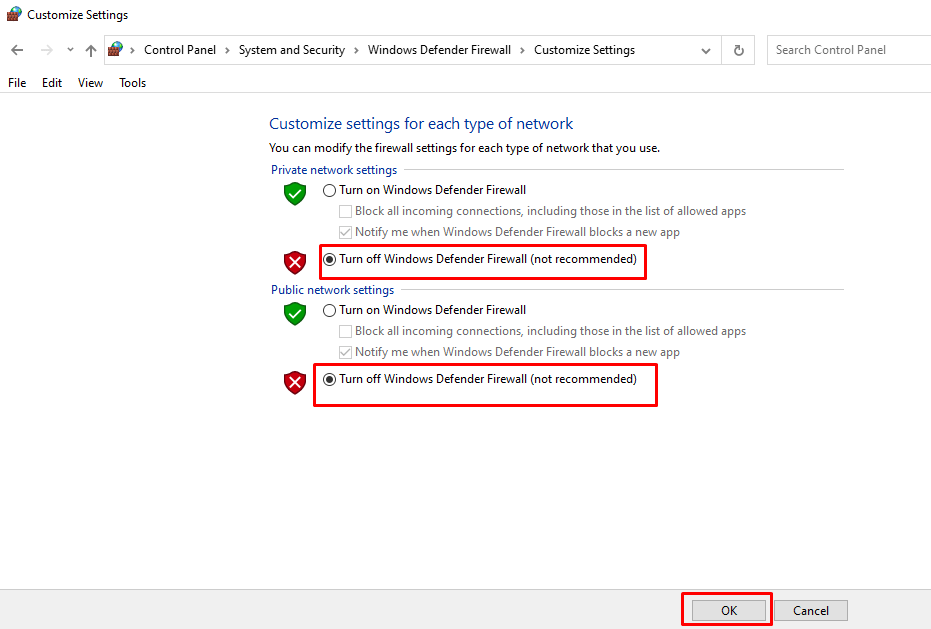 - Check the Turn off Windows Firewall (not recommended), in both the public and private Network settings sections. Then press the OK button.