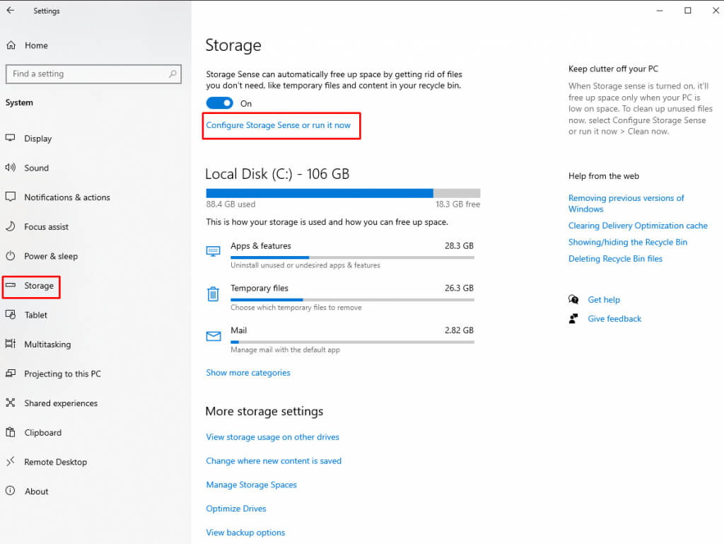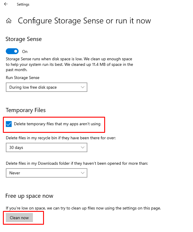 - Check the box next to the Delete temporary files that my apps aren’t using and/or click the Clean Now button under the Free up space now section.