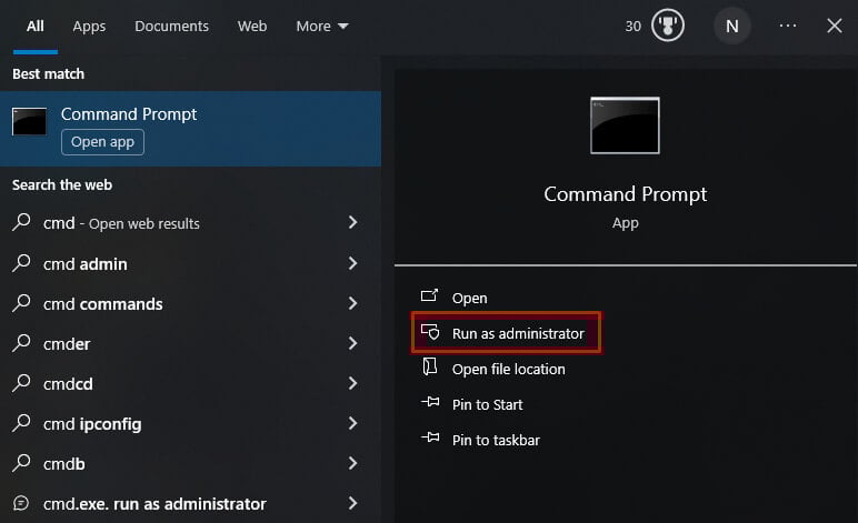 - Type cmd in the Windows search bar, then select the Command Prompt and click Run as administrator.