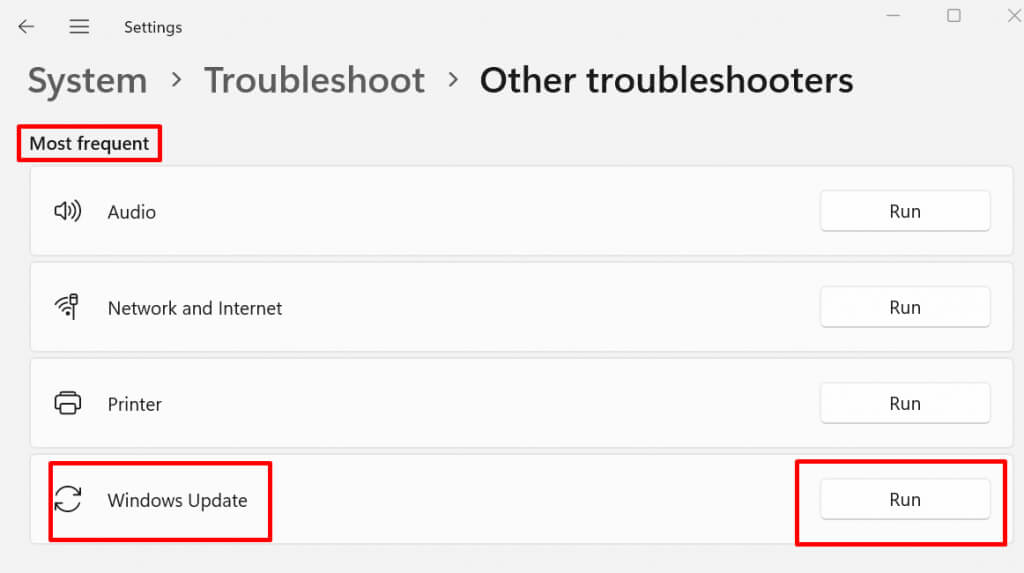 - Under the Most Frequent section find and select Windows Update. * Click Run.
