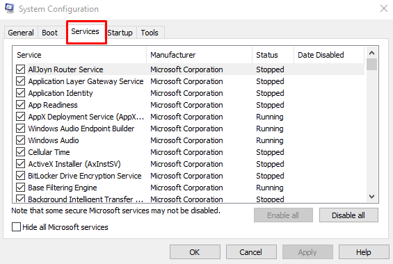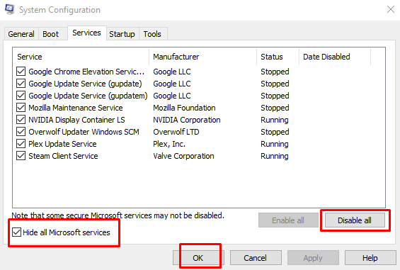 - Check the Hide all Microsoft services box at the left bottom corner of the screen. Click Disable all and then OK at the bottom of the screen.