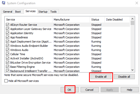 After the update is complete, re-enable the services by heading back to the System Configuration window. Uncheck Hide all Microsoft services, and select the Enable all button. Then click OK to apply the changes.