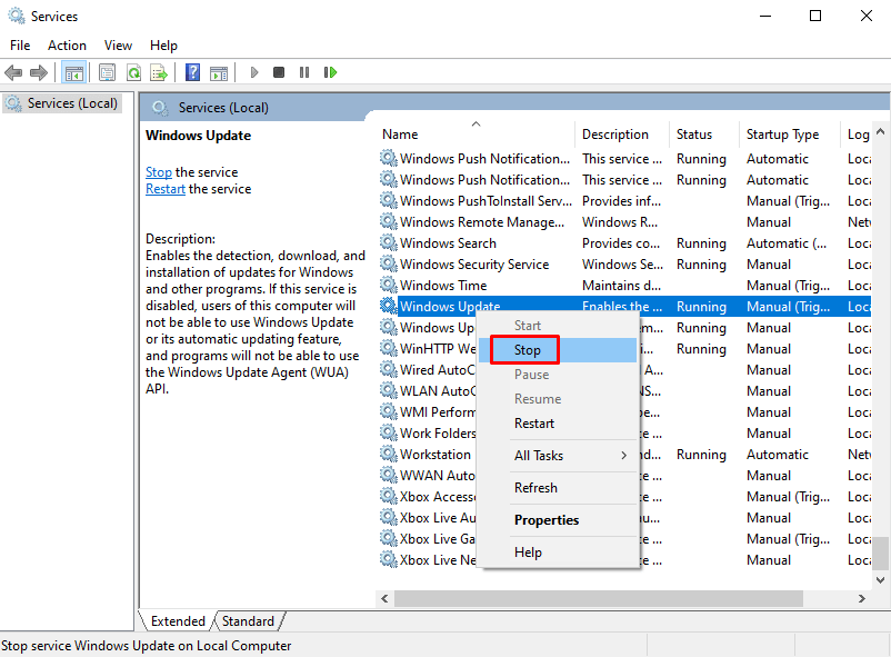 - Scroll down until you find the Windows Update service. Right-click on it and select the Stop button.