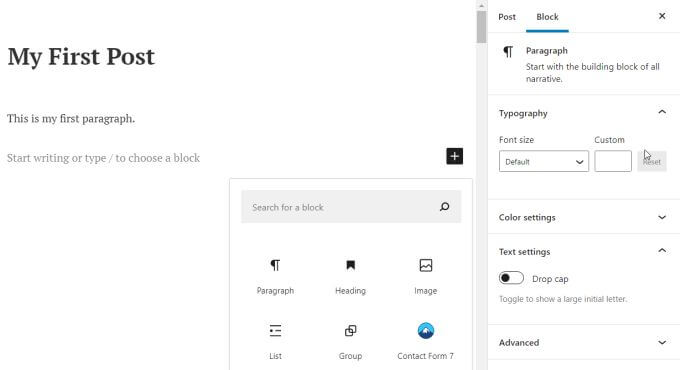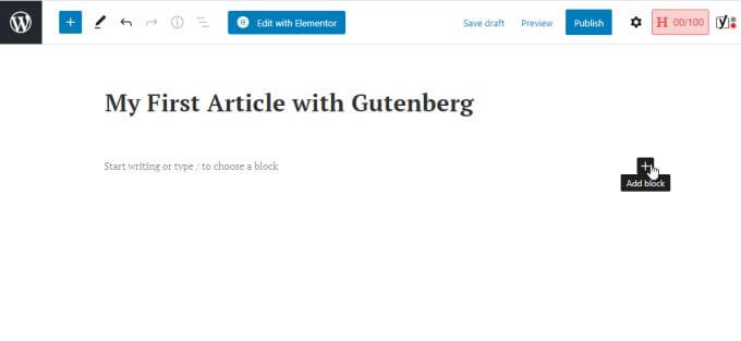 You can type the title for your post in the title field. Then select the + icon on the right to add the first block.