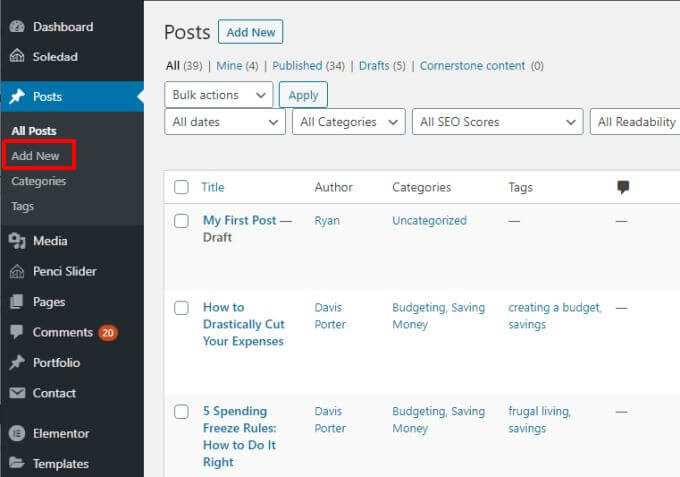 Adding a post remains unchanged from the last version of WordPress. Just select Posts from the left navigation bar, and select Add New underneath it.
