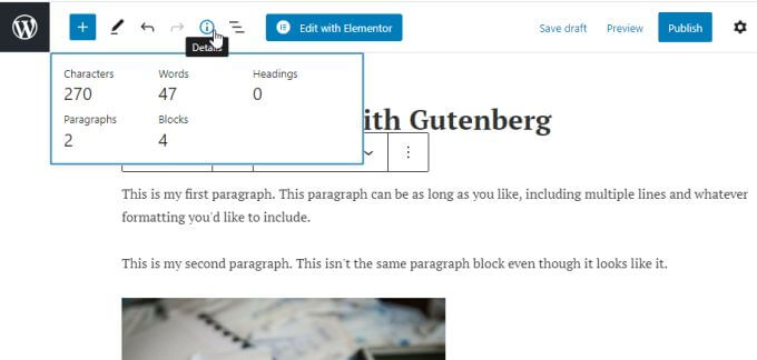 - The i (Details) icon shows you the number of characters, words, headings, paragraphs, and blocks in your post.