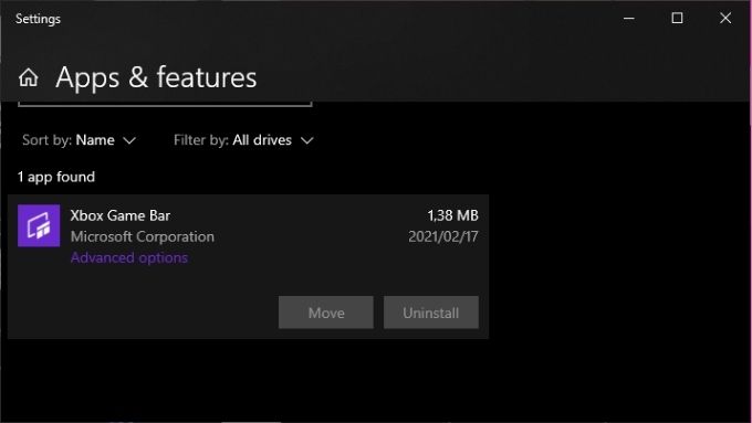 - Select **Advanced Options** in the Xbox Game Bar entry.