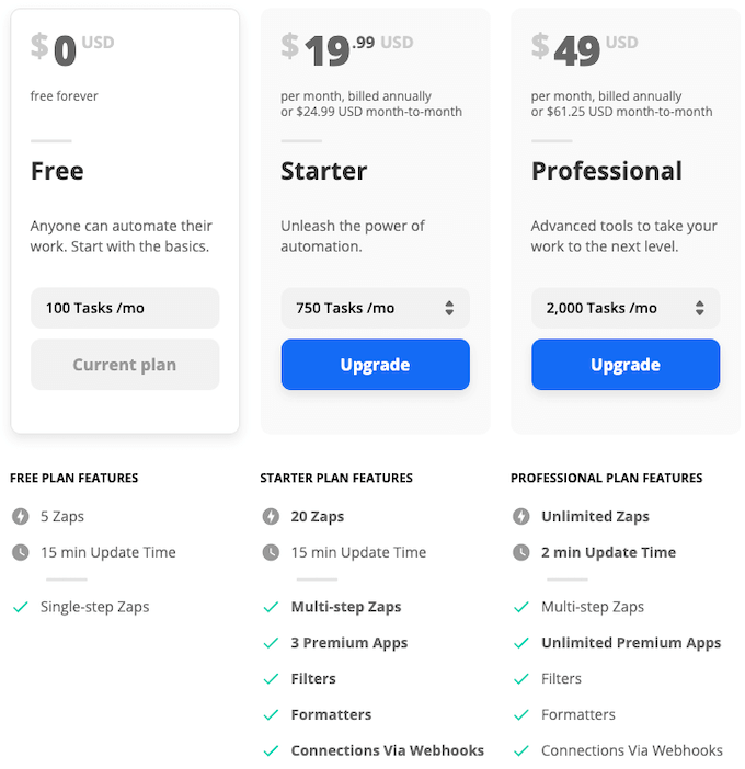 The next level up is infinitely more useful. For $20 per month (if billed annually), you get 750 tasks per month, up to 20 Zaps at a time, but are still limited with a 15 minute update time. However, you get access to Multi-Step Zaps, 3 premium apps, filters, formatters, and connections via webhooks.