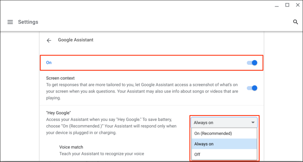 Note: Having your Chromebook always listen for the “Hey Google.” voice prompt increases battery drainage. Set the “Hey Google” prompt to “On (Recommended” to minimize Google Assistant’s battery usage on your Chromebook.