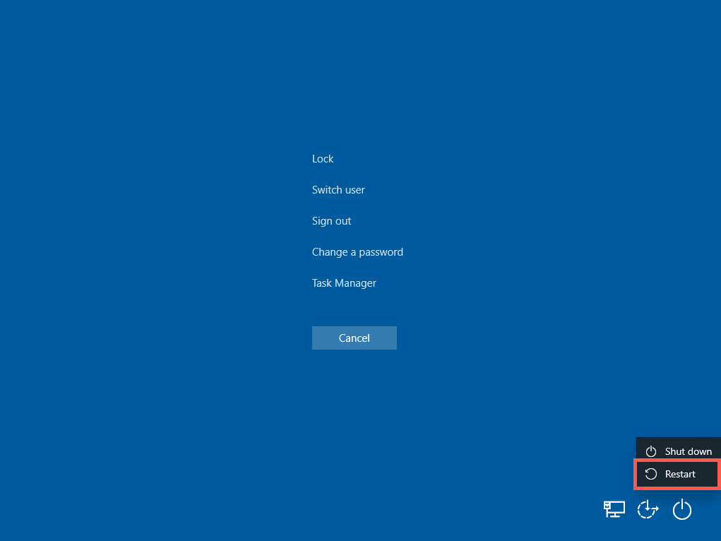One more quick way to restart your computer is to use the Power User Menu. Right-click the Startbutton on the taskbar (or press Windows + X), point to Shut down or sign out, and select Restart.