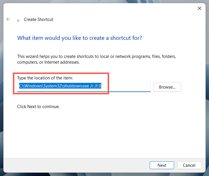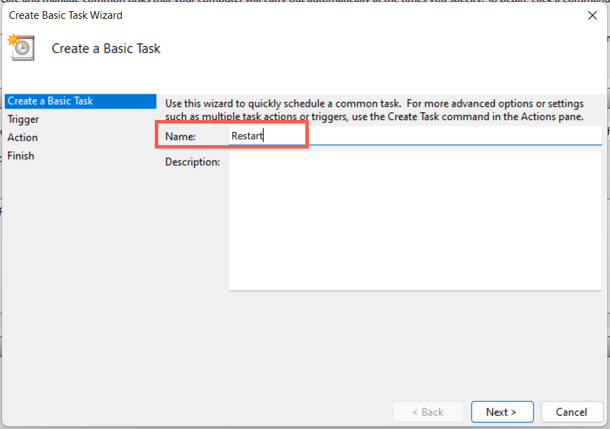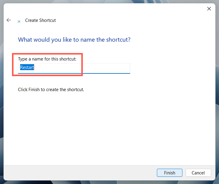 - Enter a name—e.g., Restart and select Finish to save the shortcut.