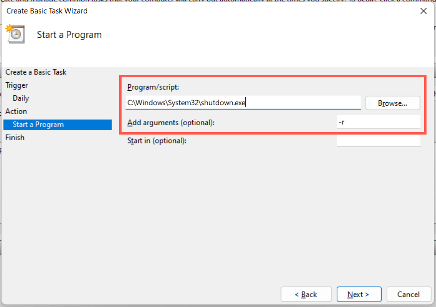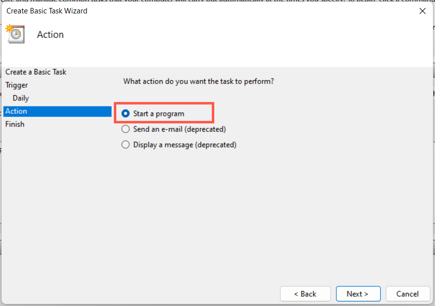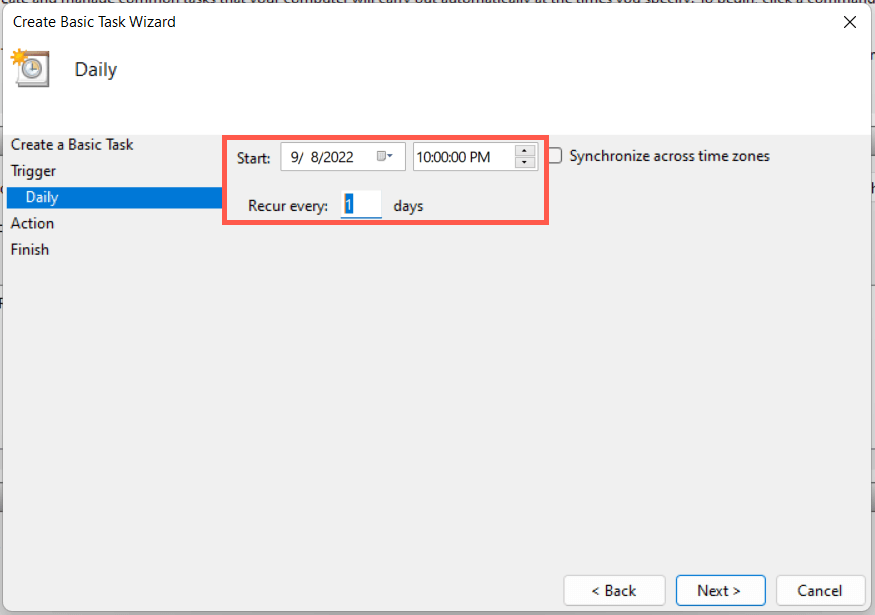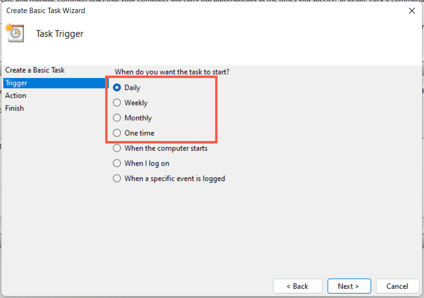 - Select Daily, Weekly, Monthly, or One Time and select Next.