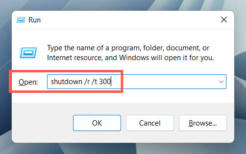 It’s also possible to execute the commands above using Run. Press Windows Key + R to open a Run box, type shutdown /r (Windows 11 will restart in 60 seconds) or shutdown /r /t time_in_seconds (if you want to perform an immediate or delayed reboot), and press Enter.
