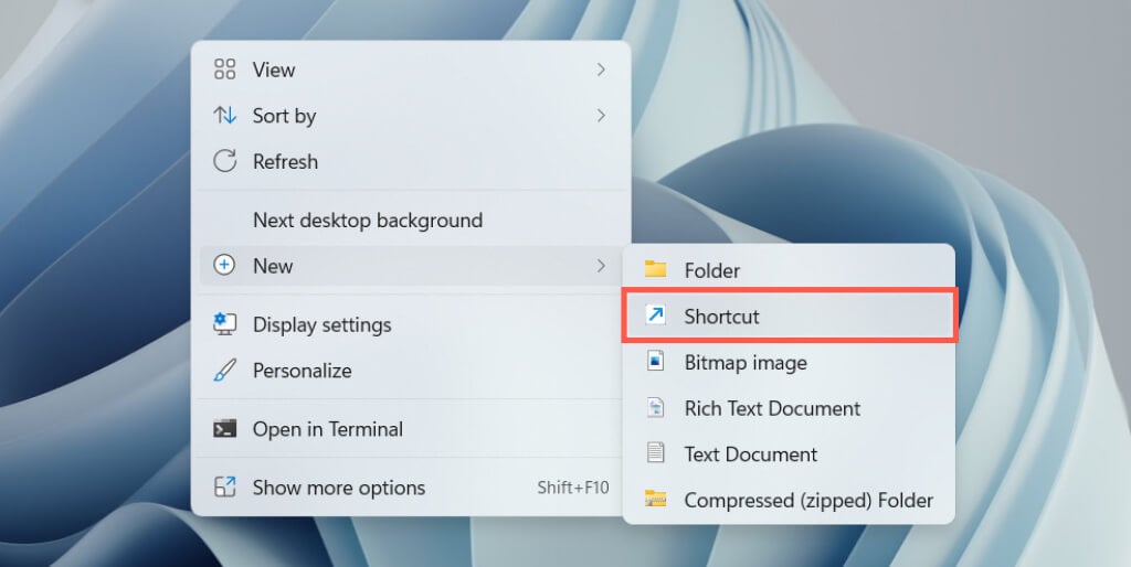 - Right-click a vacant area on your desktop and select New > Shortcut.