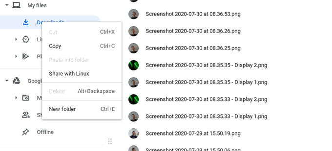 To enable file sharing, open the Files app, and navigate to the file or folder you wish to share with Linux. Right-click the file and select Share with Linux. Now you can open a Linux Terminal and type /mnt/chromeos to access the shared files.