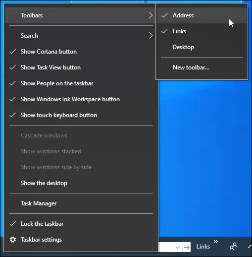 Right-click on the taskbar and go to the **Toolbars **selection. From there you can add the Address, Links, and **Desktop **toolbar. If that’s not enough, you can also create and add your own custom toolbars.