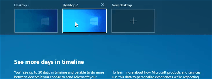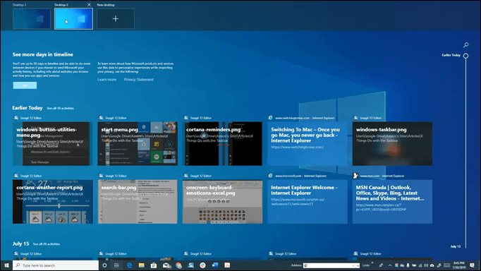 Right next to the Cortana circle on the taskbar is the Task View icon. Clicking on that does a few things, like give you a history of what you’ve done lately and show you all the programs you have open right now.
