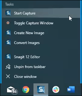 For example, when using SnagIt, you’ll see options to Start Capture, Toggle Capture Window, Create New Image, Convert Images, or open SnagIt 12 Editor.