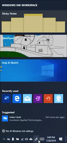 The **Windows Ink Workspace **taskbar icon is your gateway to doing doodles and making quick notes. Clicking on it will give you quick access to Sticky Notes, Sketchpad, and Snip and Sketch.