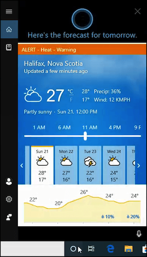 Try questions like “What time is it?” or “What’s the weather tomorrow?”. Cortana will tell you your local time and weather.