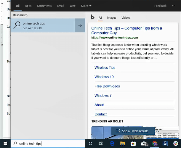 The search field next to the Windows button does what it says. It searches. When you click on it, the search pane appears. You’ll see across the top different categories. It defaults to All, meaning that it will search all of your computer and the web.