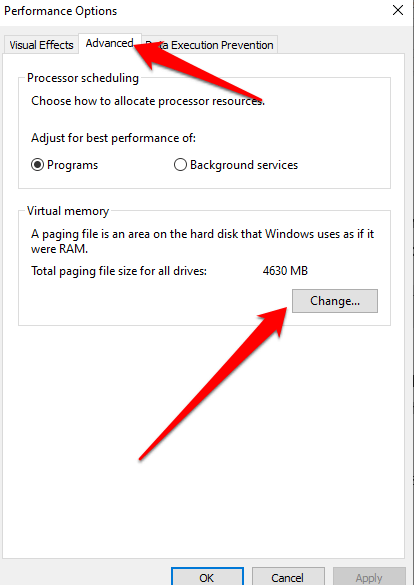 - Select **Advanced** tab in the **Performance Options** section and then go to **Virtual Memory** area and select **Change**.