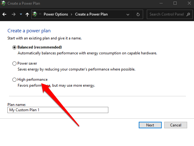- Next, select **Create a power plan** and then select **High performance power plan**.