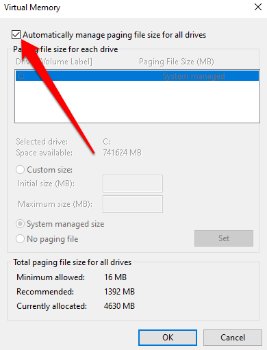 - Next, select the box next to **Automatically manage paging file size for all drives**, and then restart your computer.
